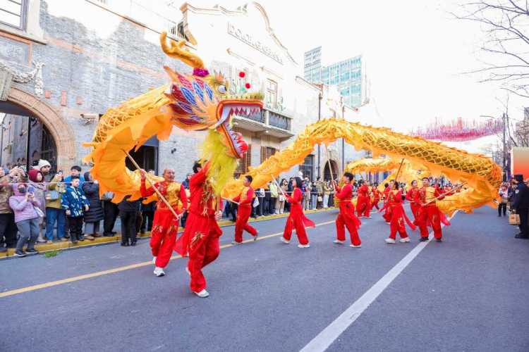 中国龙狮九段、国家级非遗代表性传承人陆大杰领衔龙狮献瑞,以“骏驰龙腾”之势巡游茂名北路;誉为“最优美的中国乐团”上海民族乐团,在安垲第艺术墙前奏响经典曲目,非遗丝竹管弦勾勒出一幅生动的海派音画。