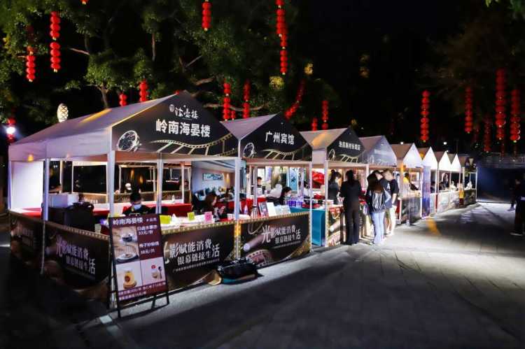 活动现场布置独具巧思,以“电影为媒•消费为场”为空间叙事核心,电影胶片造型拱门营造沉浸式入口仪式感,露天影院式布局的核心舞台区还原经典观影仪式感,沿动线设置的“电影+市集”集群实现从观影到消费的自然衔接。同时,现场融入胶片、放映机等电影基因,以及岭南灯笼、珠江岸线灯光等湾区印记,搭配沉浸式灯光装置,让观众在光影流动中感受广州的文化底蕴与消费活力。
