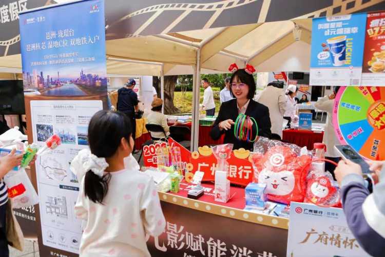 活动现场,海珠广场化身沉浸式光影消费体验场,9:00至21:00间,嘉宾签到互动、启动仪式主流程、电影嘉年华三大环节依次精彩上演,全方位打造沉浸式“电影+”融合消费新场景。在嘉宾签到与互动体验环节,影视打卡墙、融合体验区让到场嘉宾沉浸式感受电影与生活交融的独特趣味;30个特色展位同步开放,涵盖电影IP体验、文旅融合优惠、电影文创消费、金融联动促消费等多元板块。